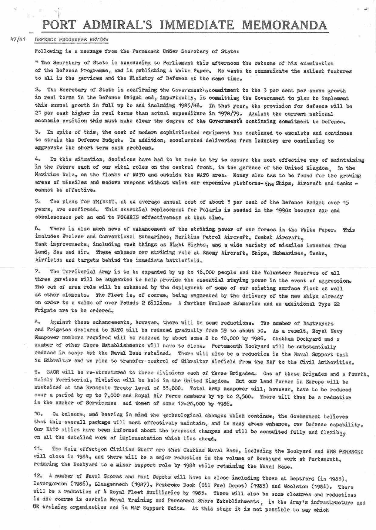 In this White Paper document, the Secretary of State at the time John Nott, said that the Dockyard would close in 1984 (see point 11 in the picture below). Providing reasons for this decision, he said that the cost of modern equipment had strained the Defence budget.